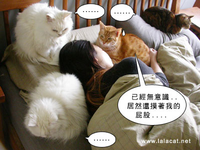 2個人4隻貓要擠在一起,實在是很辛苦喔!